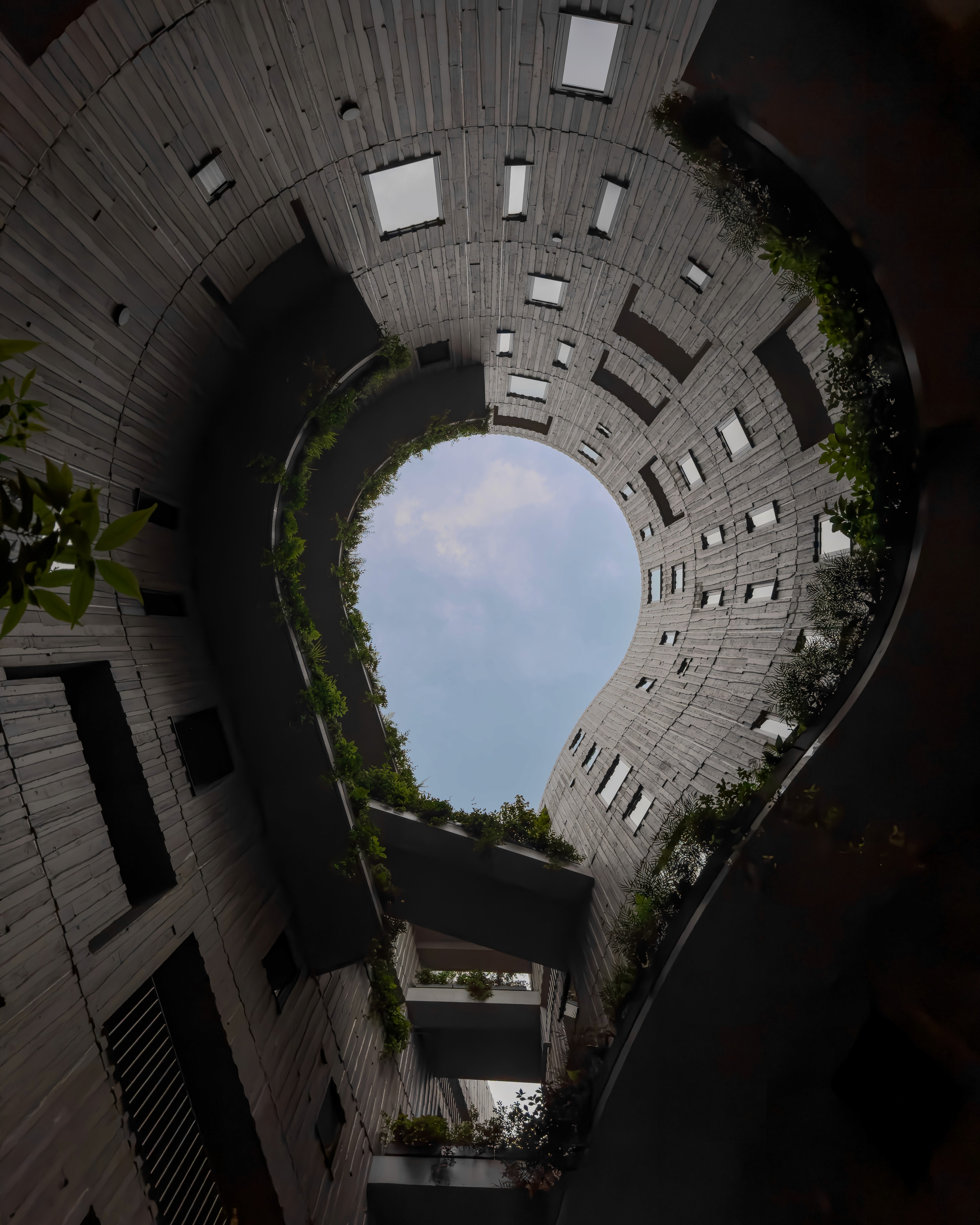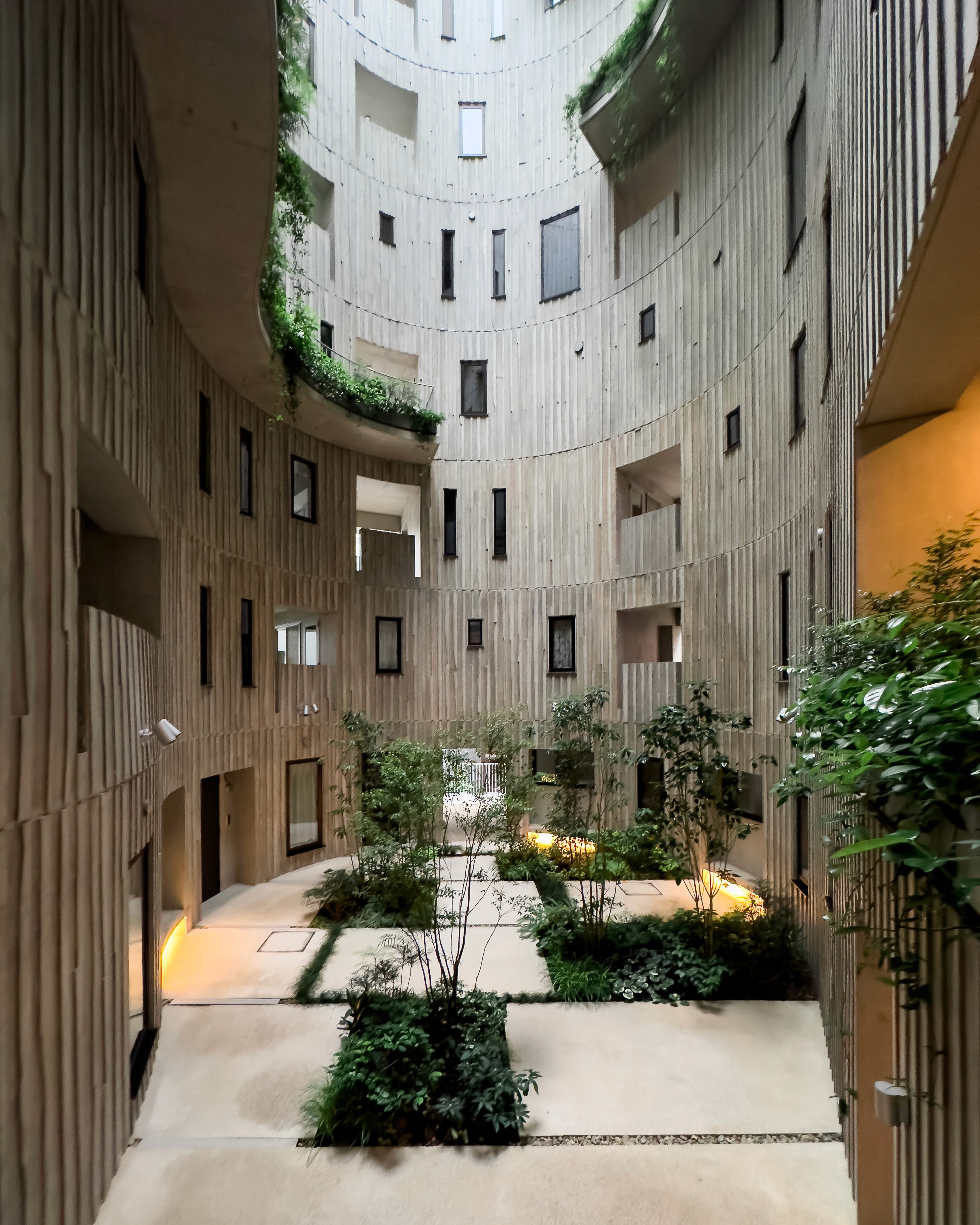 한국에서는 흔히 보기 힘든 형태이다. 마치 고무 팔찌를 찌그러 트린 것처럼 생긴 건물의 바닥 모양은 자연스럽게 가운데 중심공간을 만든다. 중심 공간은 작은 공원을 형성하며, 하늘에서 떨어지는 빛을 그대로 받아들인다. 여기저기 걸린 조경이 콘크리트 그리고 주황색 바닥 재료와 어우러지며 깔끔하고 아름다운 장면을 만든다. 외곽 3면으로는 경관을 줄 수 없으니 입주민들에게 내부로 새로운 조경 공간을 제공하며 그 한계를 극복해나가는 모습이다. 특히나, 이 형태는 몇 세대에게 집밖으로 나오면 세대별 시각적 간섭이 생길 수 있는 단점이 있지만 그만큼의 새로운 경험을 전하고 있다. 주거 공간의 획일화 보다는 다양성을 드러내며, 취향에 맞는 사람들에게는 매우 적합해 보인다.