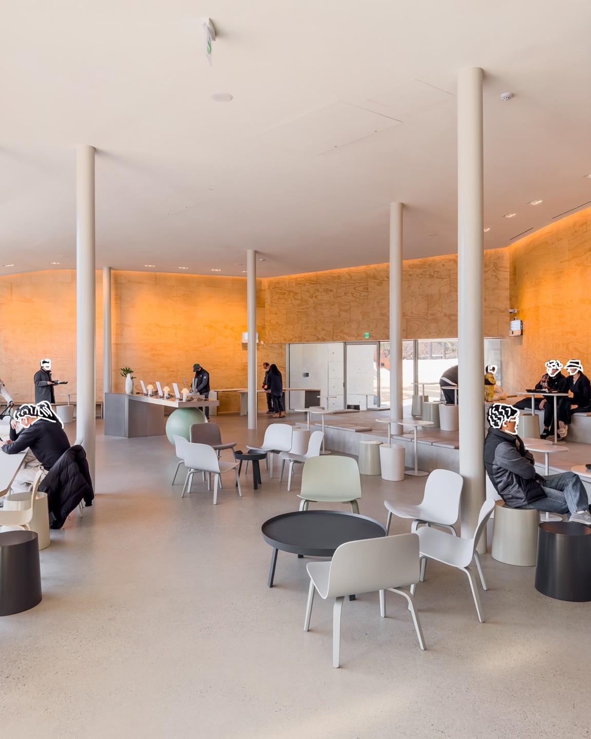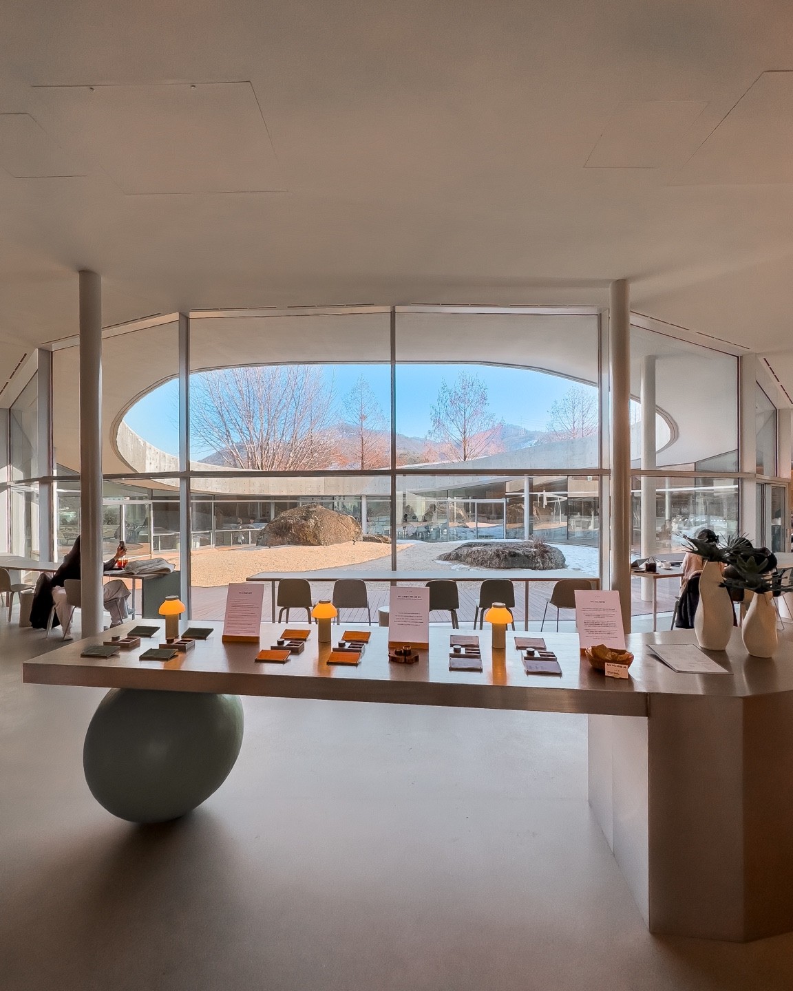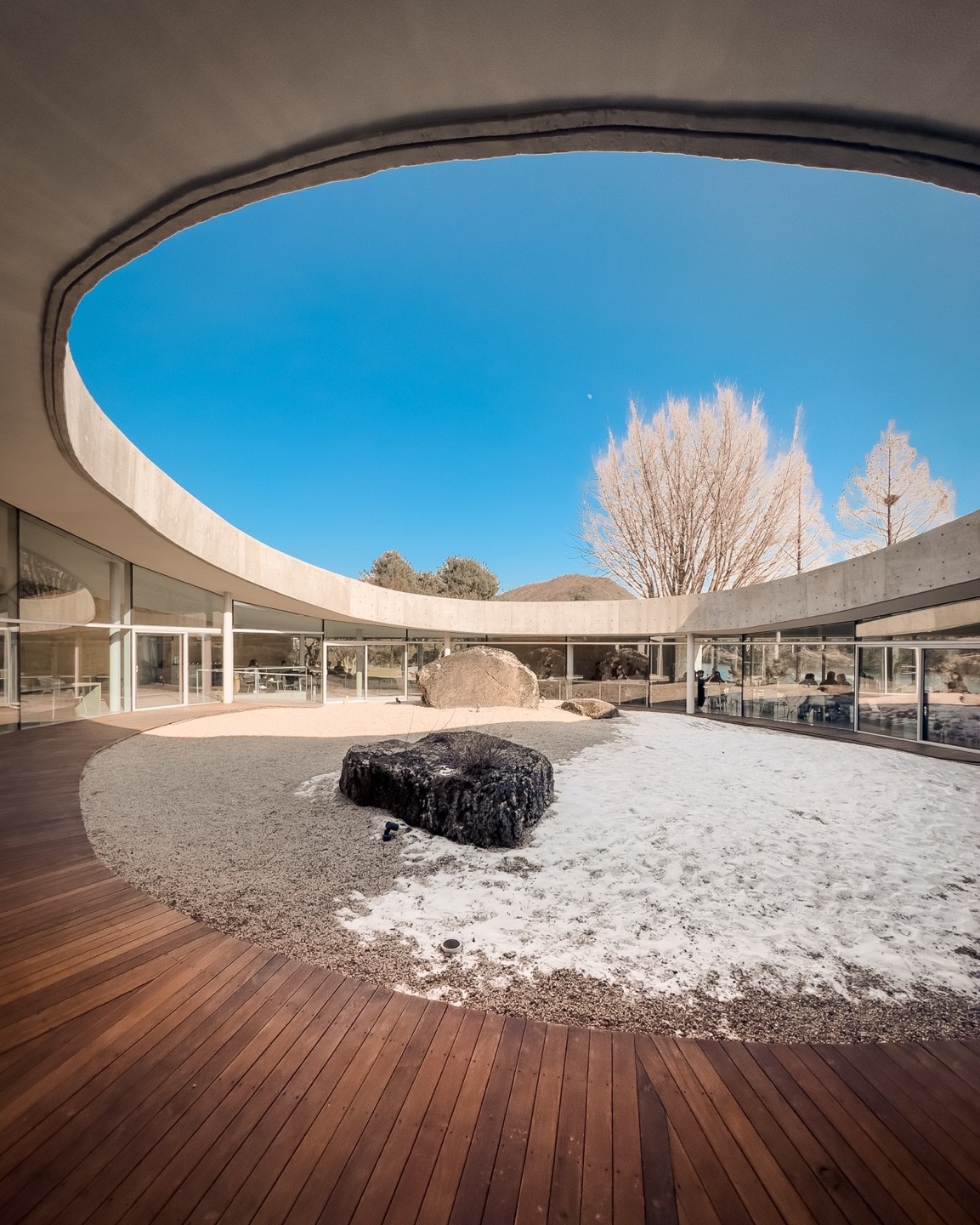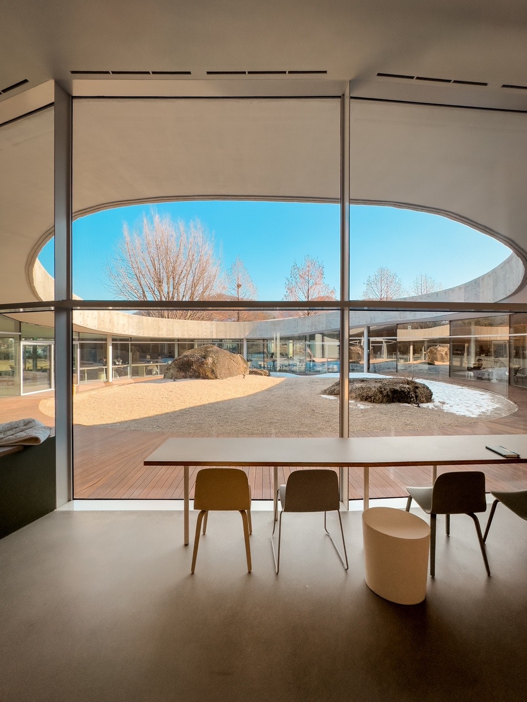 그 땅의 형상을 그대로 들어 올리지만 등고선과 같이 알 수 없는 곡선의 형상을 통해 그대로 들어 올린 것처럼 생긴 공간은 자연스럽게 가운데 거대한 구멍을 만들어 낸다. 거대한 중정의 천장에는 하늘이 담긴다. 땅의 힘을 따라 형상을 올렸지만, 인위적으로 생긴 벽과 천장은 다시 하늘을 받아들이고 경험자에게 자연의 순간을 전달한다.