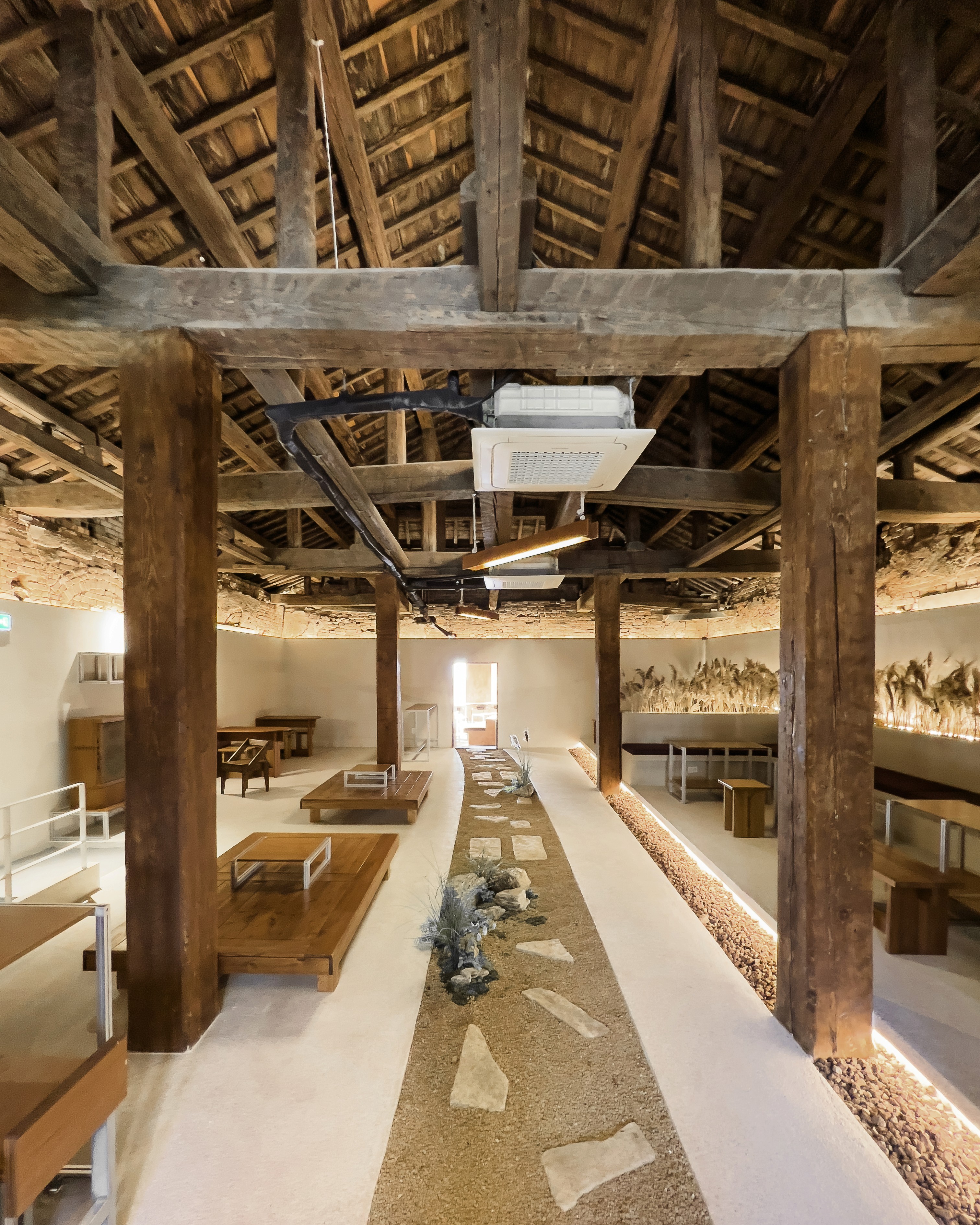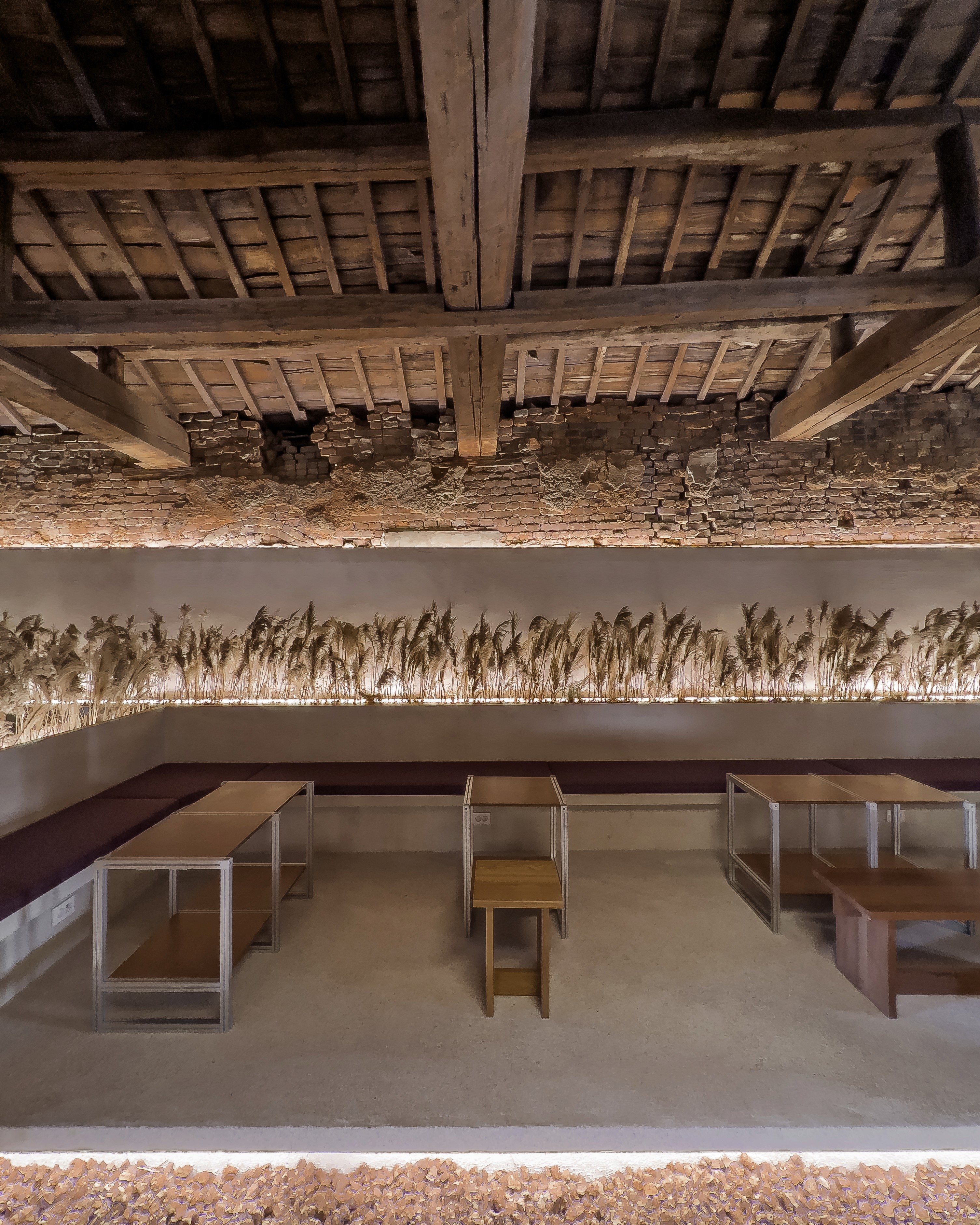 더군다나 벽은 어떨까? 벽돌로 쌓아 올려진 지 100년이 넘은 건물 벽면이 성할 리 없다. 천장의 구조도 이제 제 역할을 하기 힘들다. 1층을 보면 이곳은 사람 머리까지만 새로운 벽면을 대고 있다는 것을 알 수 있다. 그리고 천장에는 남겨진 나무구조 밑에 다시 철골로 보강을 한 흔적도 보인다. 철골이 눈에 띄지 않도록 하얀게 둘러 마감하고 그 격자는 자연스럽게 액자가 되어 구조가 전시물처럼 보존되고 있다.