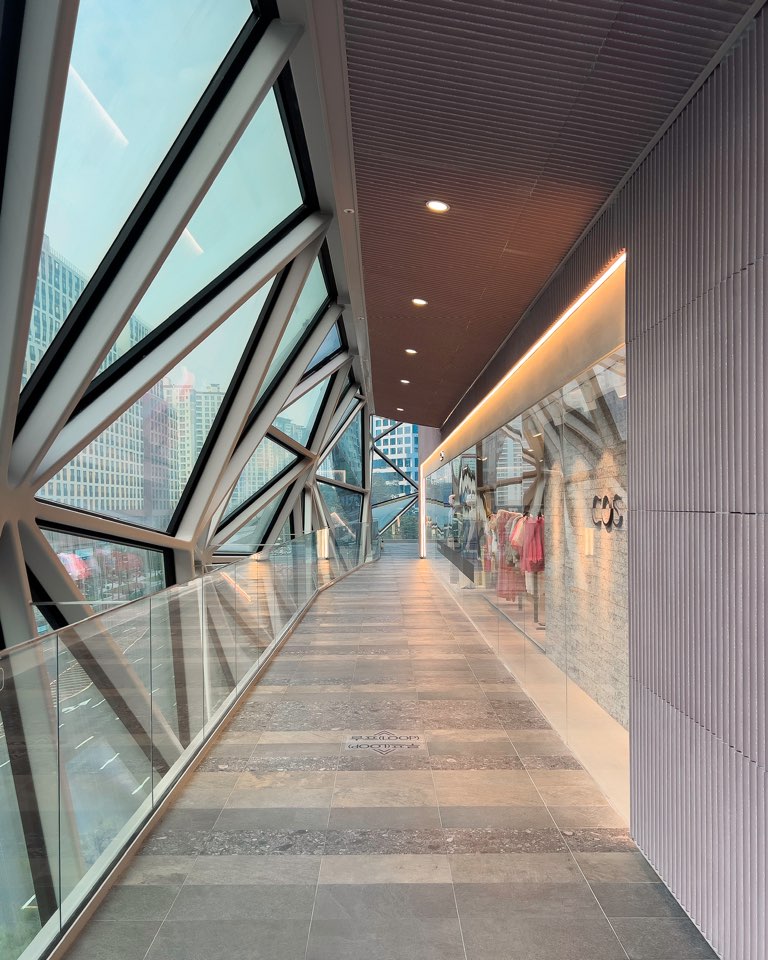 이렇게 그 유리관 산책로를 따라 경험하다 보면 이곳이 백화점이냐는 의문이 든다. 유사 전망대와 카페, 로드샵, 책방 그리고 자유로운 공공공간의 성격을 띤 열린 공간들의 연속은 백화점의 속성 보다는 도시의 경험에 가까워 보인다. 그러나 여전히 이곳은 백화점이다. 그 건물의 덩어리를 휘감는 유리관을 빠져나와 덩어리의 중심으로 가면 또 전통적인 백화점의 규칙들이 보인다. 그러나 여전히 열린 유리관을 통해 도시의 배경을 내부로 끌어들이며 보편의 백화점에 새로운 감상을 던진다.