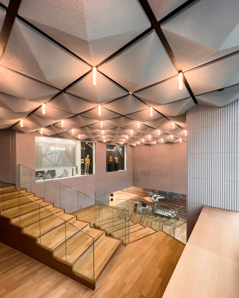 위에 언급된 내용들은 이 건물에 일부 적용되는 듯 보이지만 반 이상은 그것을 전혀 따르지 않고 있다. 공간은 보편적 백화점이 가진 규칙부터 파괴한다. 중심에 수직으로 이동하는 이동 공간이 에스컬레이터가 있고 그것을 돌게 하는 것도 맞지만 비대칭적으로 방향을 틀어가며 정적인 동선을 파괴한다. 이것은 약과다. 백화점이라 하면 본디 구석진 곳의 엘리베이터와 정확한 방식의 에스컬레이터만이 위아래로 층을 이동하는 수단이겠지만 이 공간은 입장과 동시에 그 보편적 백화점이 가진 특징들을 무시하고 바로 건물 외곽면을 통해 백화점을 산책하듯 오르는 방식을 입구에서부터 제안한다.