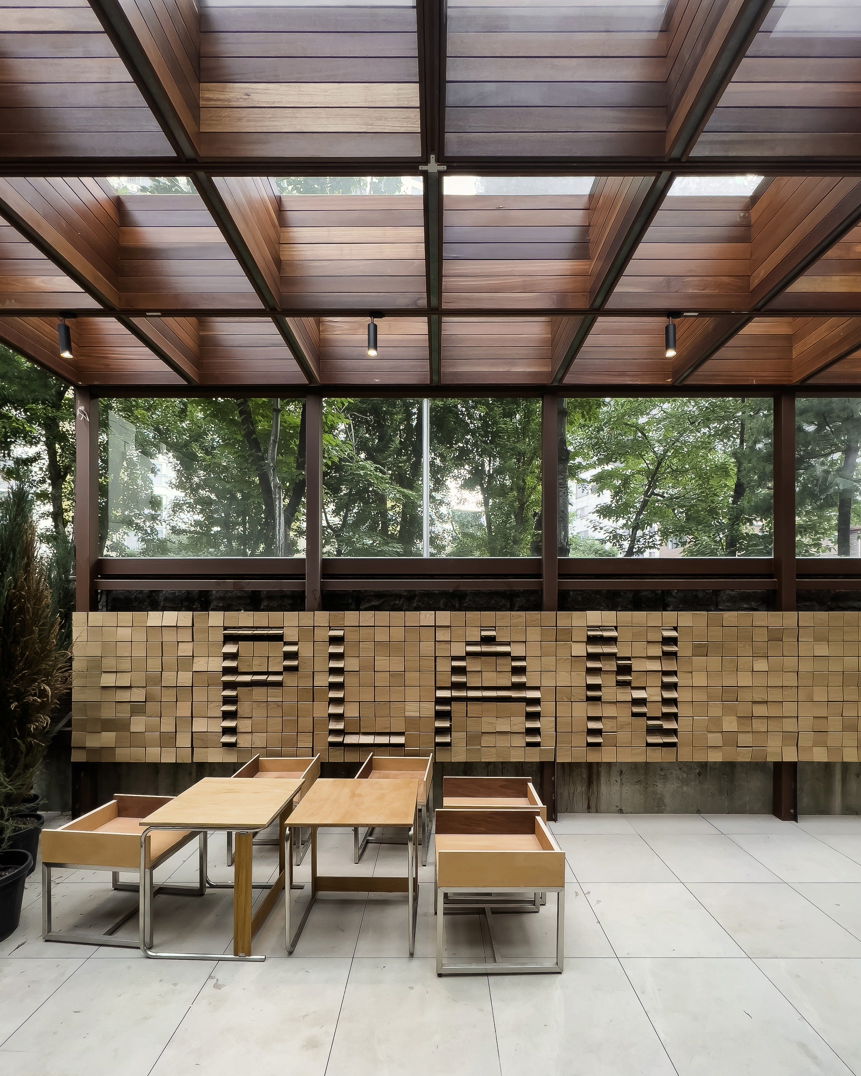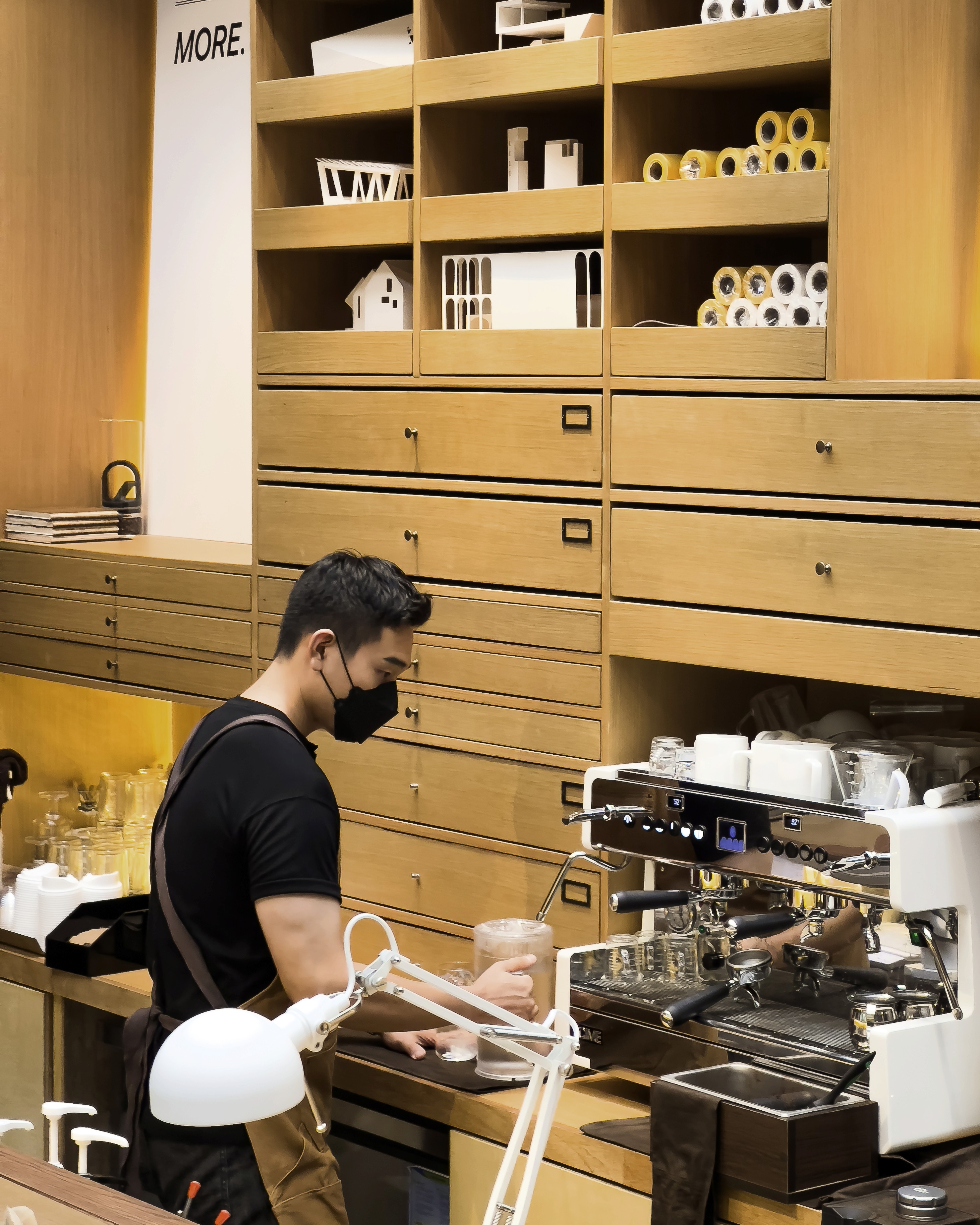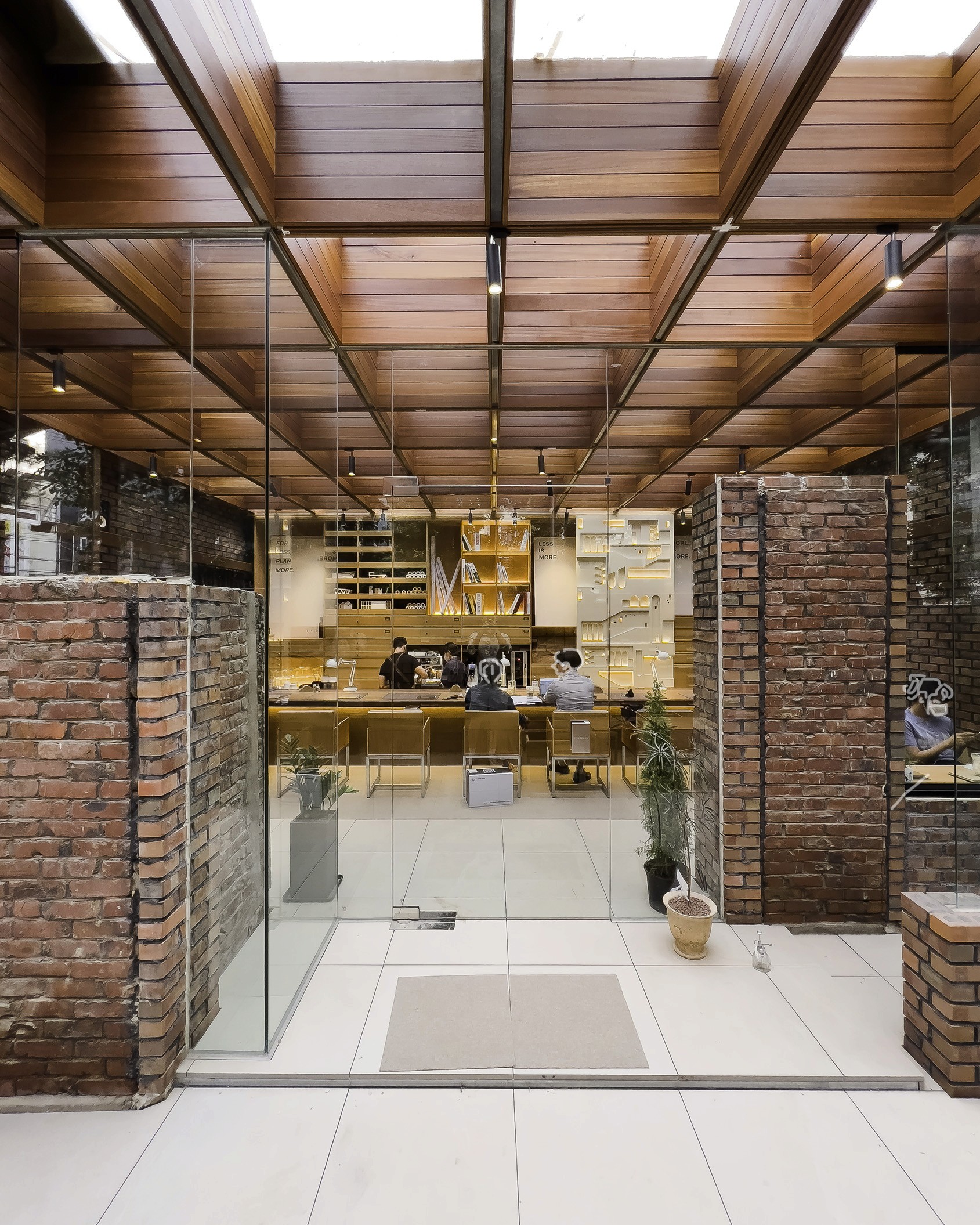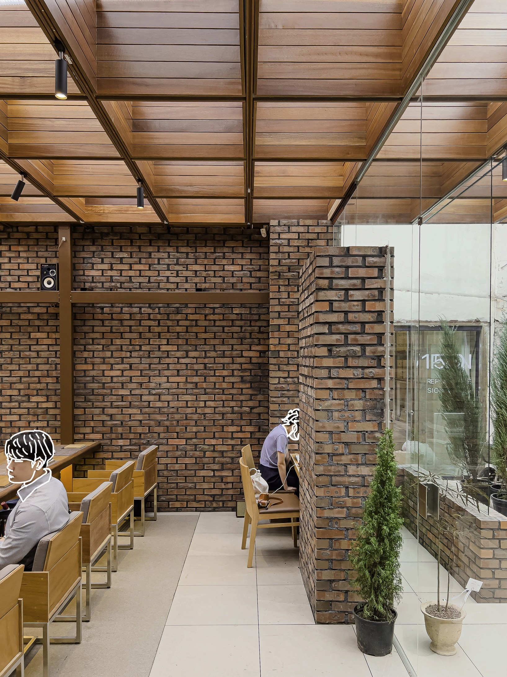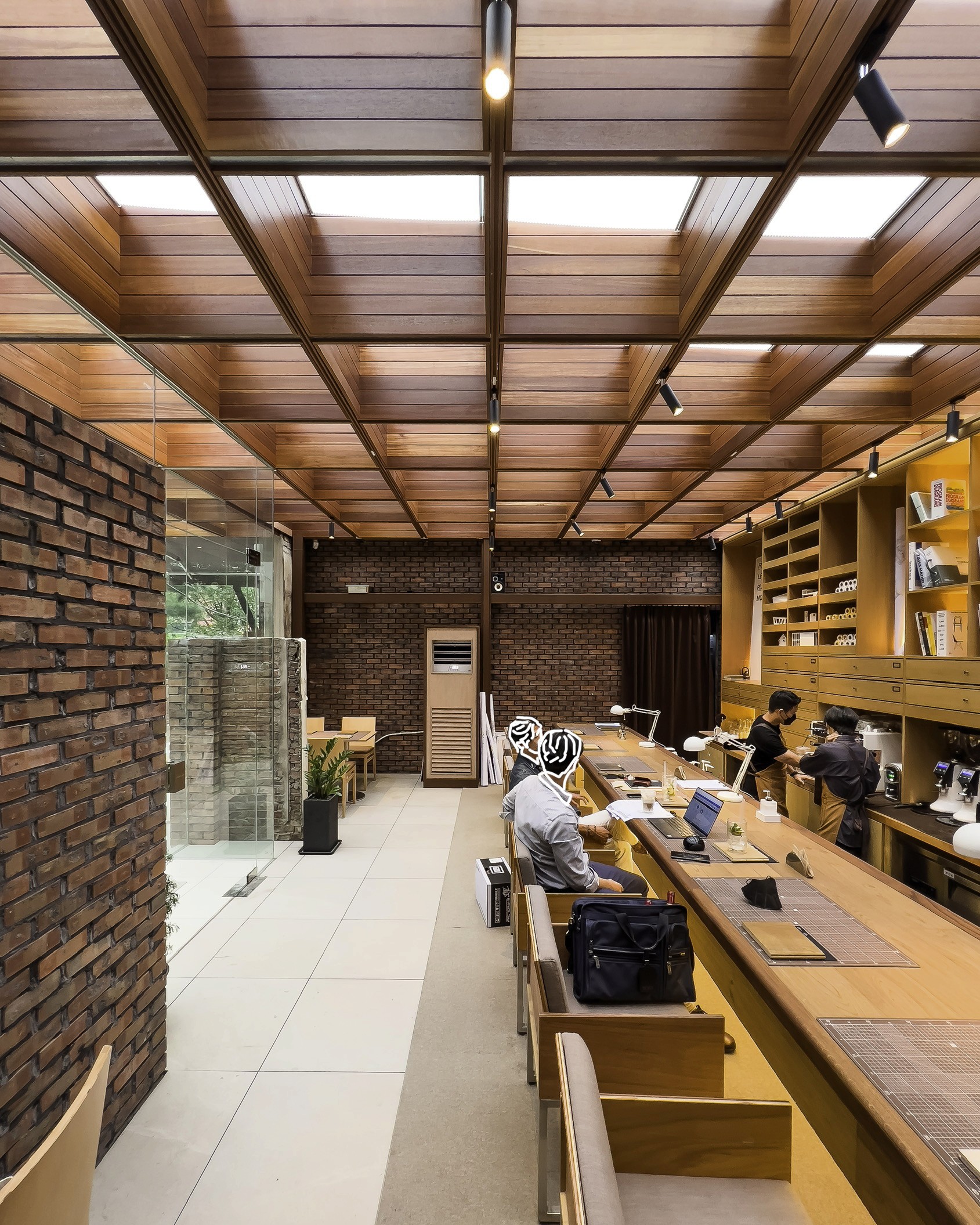 이곳은 그리 큰 면적은 아니다. 진입 동선도 활짝 열리지 않았다. 아파트 단지와 24시 편의점 사이 골목길을 들어가야 도착할 수 있는 곳. 과거에는 공장이었다고 한다. 과거 공장의 벽만 남기고 나머지는 새로 했다. 그런 만큼 이곳은 ‘작은 면적’에 ‘벽’이라는 제약이 생긴다. 벽이 남겨진 부분에 맞도록 창문의 크기를 섬세하게 잘라서 딱 맞도록 설계를 하게 되는 등. 특별히 ‘디테일 도면[실제로 건물을 어떻게 짓게 될 건지 그리는 상세도면 말한다.]’을 열심히 그리게 될 수밖에 없다. 더군다나 천장에 격자형 구조물을 올리며 바닥의 선과 스테이션의 위치 타일의 배치 등을 가급적 그림처럼 딱 맞아떨어지도록 설계하며, 공간이 아주 근사해 보이도록 준비하고 있다. 이 말은 결국 도면을 그린 사람이 현장에 상주하면 이것대로 지어질 수 있도록 최대의 노력을 했다는 소리며, 이미 짜여 나온 건축 자재들의 크기를 잘 조율해 최대치의 설계를 해냈다는 소리이다.