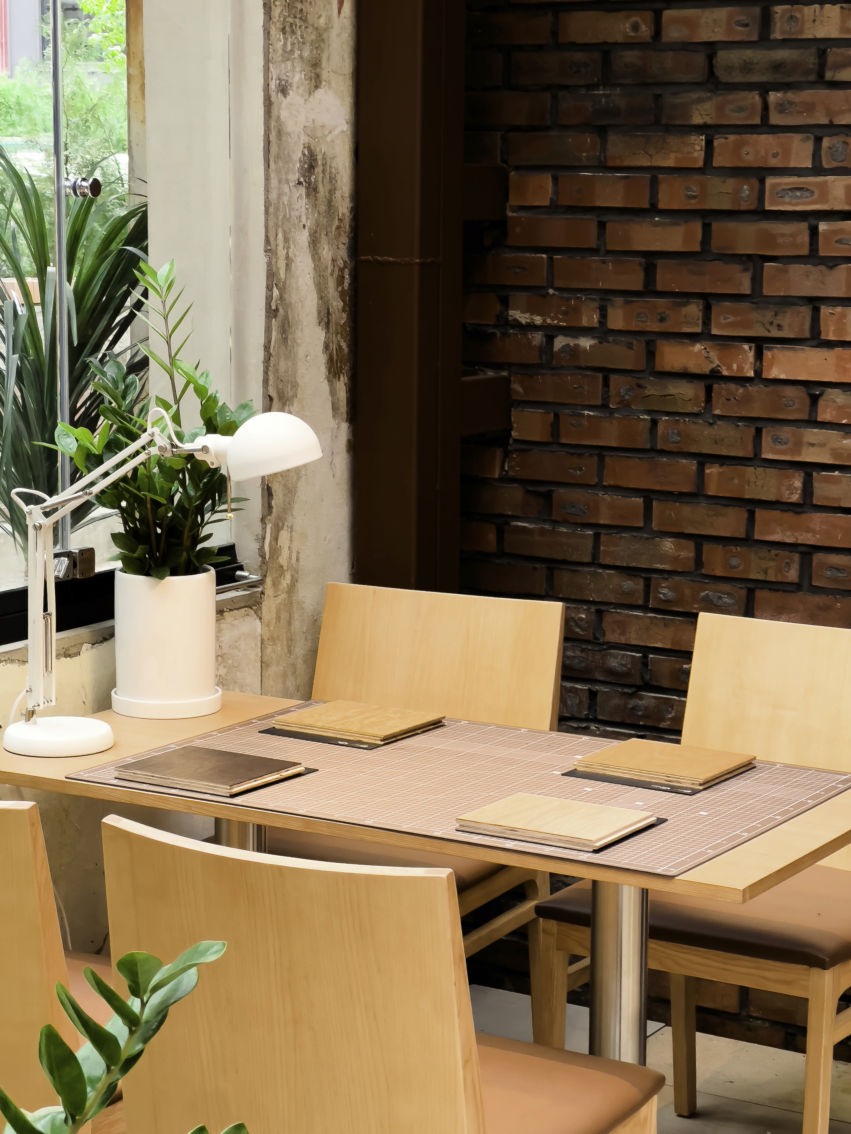 손님들이 앉는 바 자리에는 ‘건축학도’라면 반드시 아는 고무판을 올리고 커피를 올리는 코스터로는 ‘목재 샘플’을 그대로 이용하는 등 컨셉에 따라 ‘건축’과 관련된 무언가들을 계속해서 이용한다. 테이블 스탠드마저 실제 건축 사무실에 가면 종종 마주하게 되는 디자인의 테이블 스탠드이다.