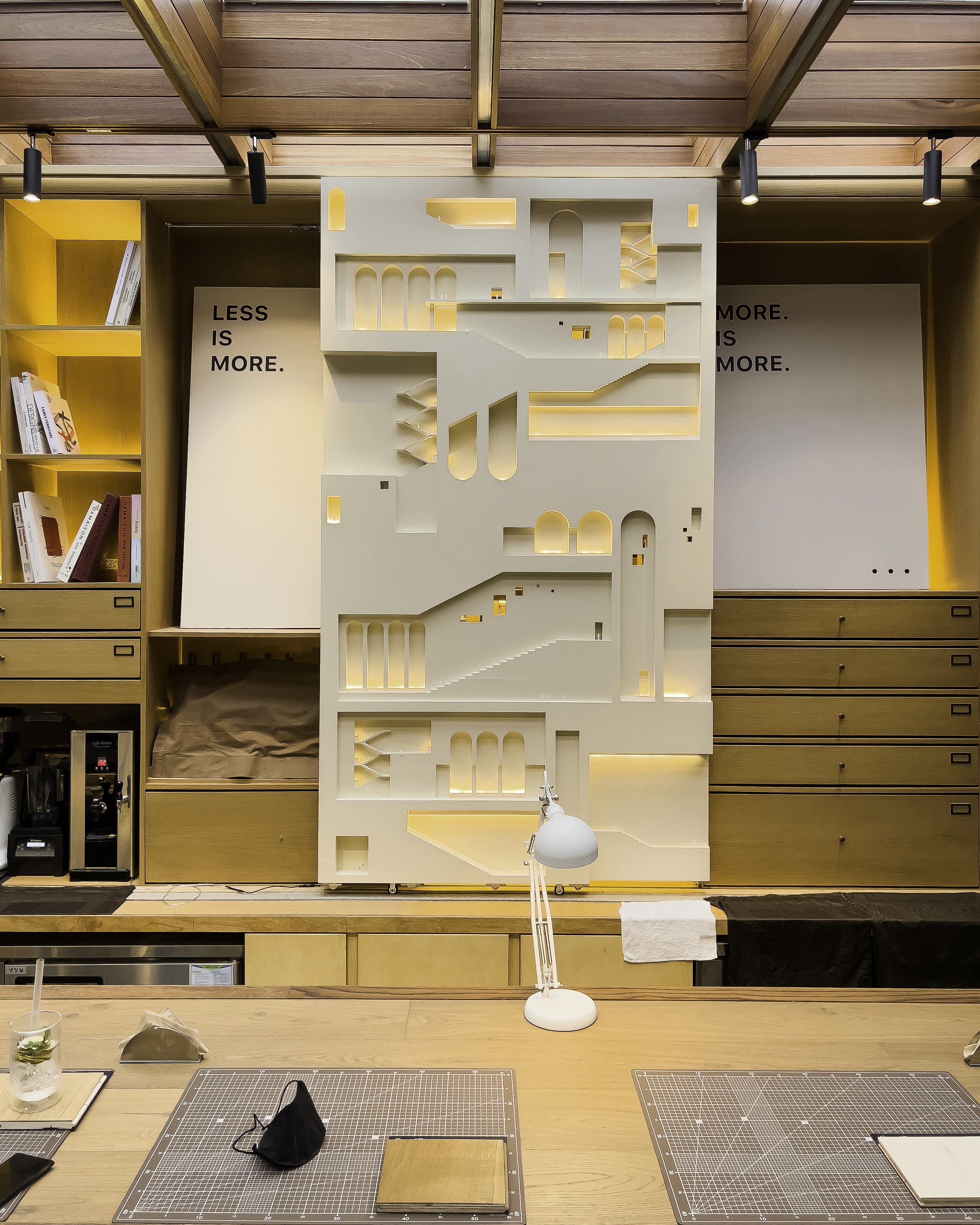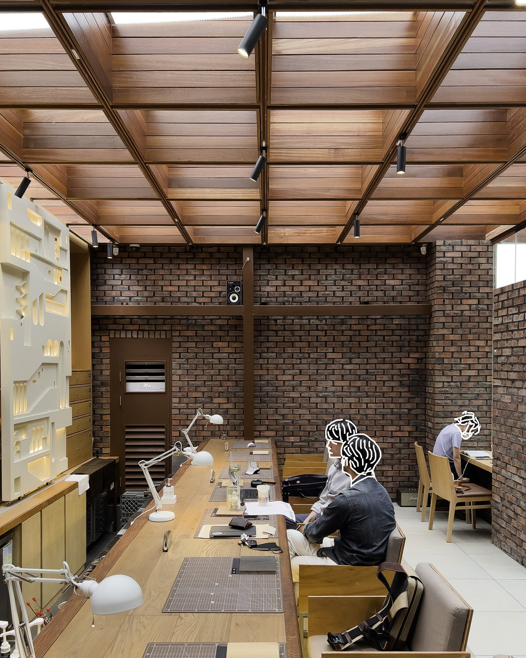 특별히 장식적인 부분이라곤 딱 하나 크루들이 쓰는 스테이션 장에 놓인 거대한 건축 SECTION MODEL[단면 모형, 케이크를 잘라 속을 보는 모형이라고 생각하면 좋다.]이다. 그 외를 제외하고는 공간의 컨셉에 맞도록 3가지의 재료 ‘나무’, ‘포세린타일’, ‘남겨진 벽돌’을 통해 톤을 만들어낸다. 이것도 아주 섬세한 표현이지만 별것 쓰지 않고 아름다움을 만드는 작업 방식이다.