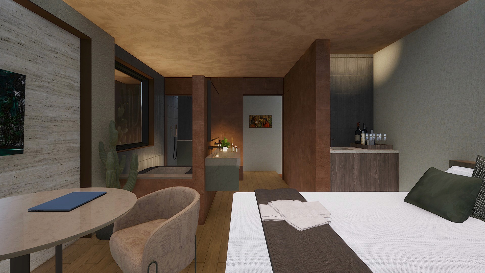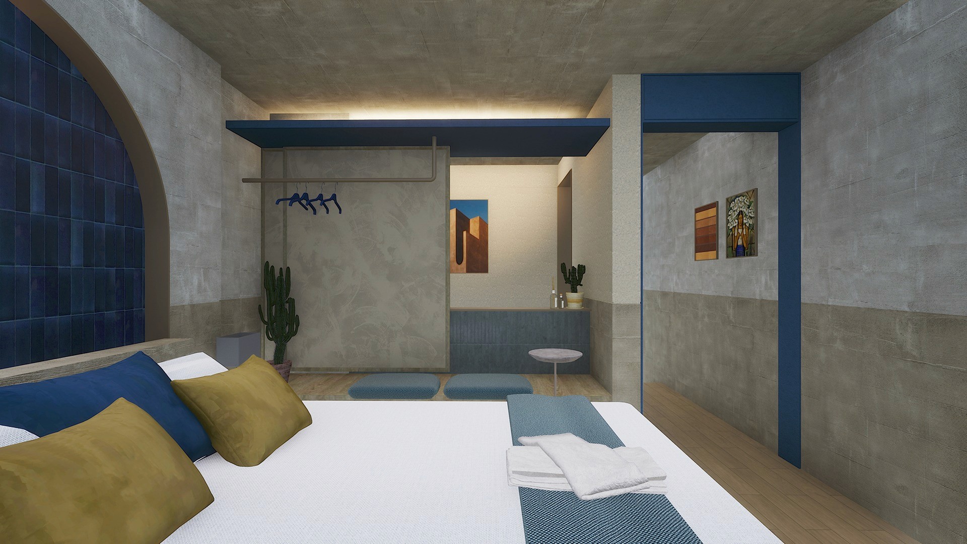 독립적으로 인식되는 하나의 해운대 를 우리는 둘로 나누어 해운대가 가진 다른 매력을 그리고 싶었다. 모든 호텔이 바다 전망 혹은 바다까지 몇 분이라는 접근성을 가지고 바다만을 조명하지만 우리는 그러지 않기로 했다. 해수욕장에서 바다를 즐긴다면 이곳은 또 다른 독립적인 성격을 가지고 구름을 조명한다. 공간은 4면을 완전히 막아선다. 해수욕장이라는 배경이 바다를 통해 하나로 묶이듯, 바닥과 벽이 하나로 묶이며 이곳도 공간의 구성 요소들 조화를 통해 하나의 독립적인 공간을 가진다. 주변에 무수히 많은 숙박 공간을 둘러싸고 오션뷰하나 없는 이곳만의 경험이 있다면, 하늘만 보인다는 것이다.