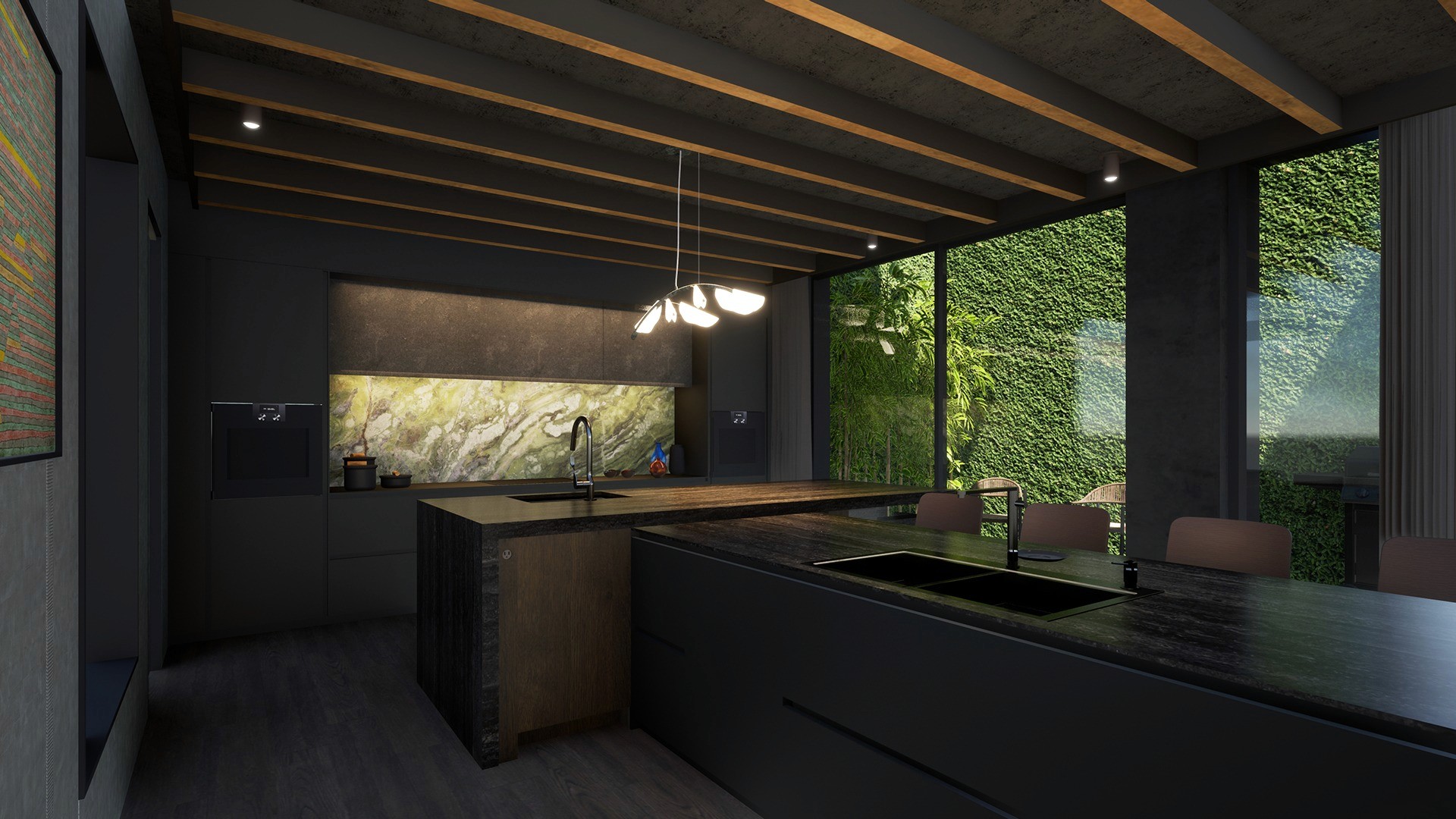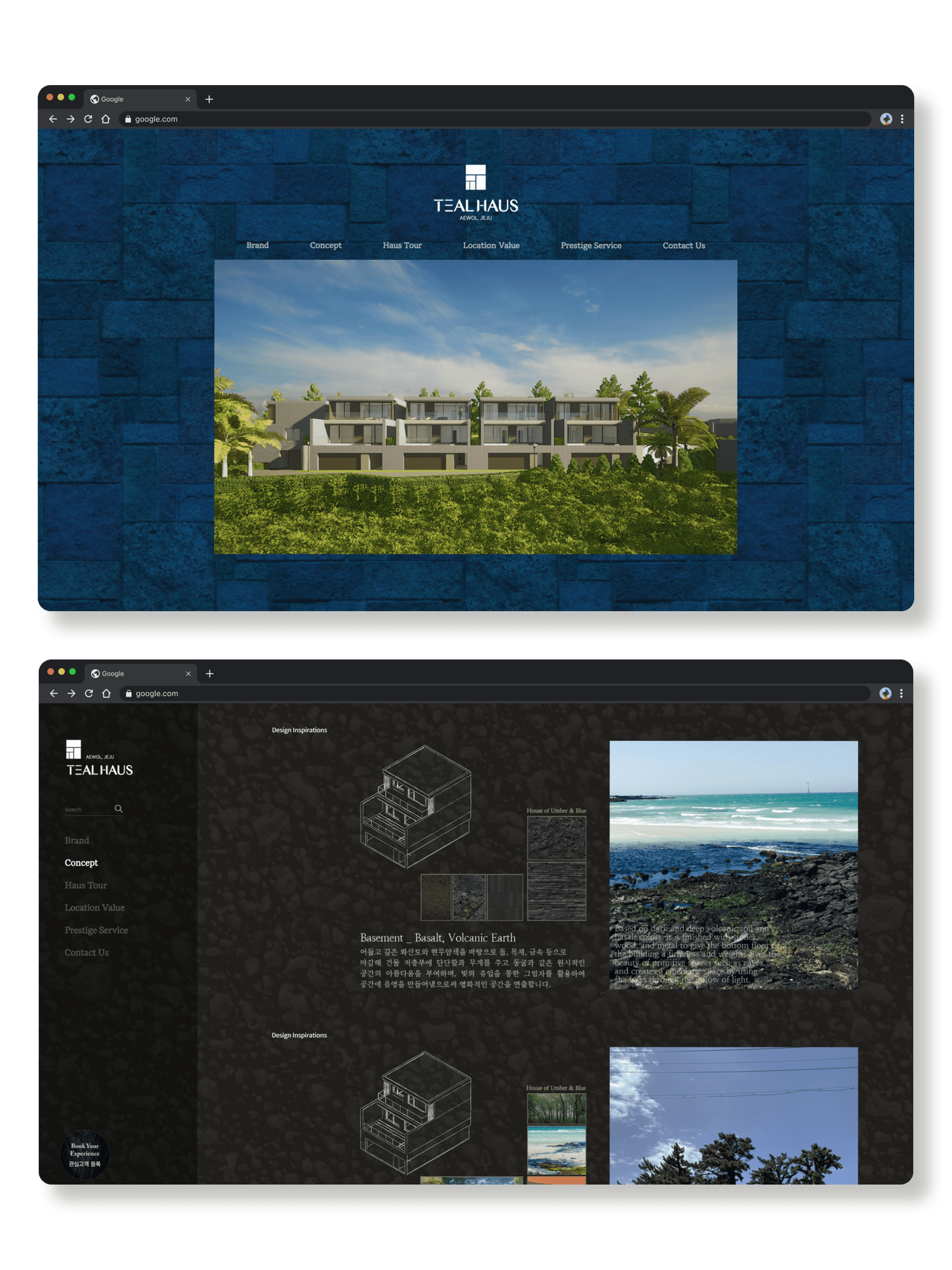공간의 진입 동선에서는 하늘이 열려있어 옅은 푸른색이 항상 담긴다. 거실에는 애월 언덕에서 내려다본 푸르른 바다가 기다랗게 걸린다. 책을 읽고 음악을 듣고 멀리서 넘어오는 파도 소리와 바람 소리를 들으며, 이곳의 푸름을 즐긴다. 해가 진 공간의 2층. 조용한 동네의 밤은 애월의 바다와 만나 창창하니 짙은 푸름을 띈다. 바다와 하늘의 경계가 보이지 않는 군청색 도화지에 별이 걸리고 달이 걸린다. 어둑한 밤 푸른 어둠 속에서 별빛과 달빛 의지에 잠을 청한다.